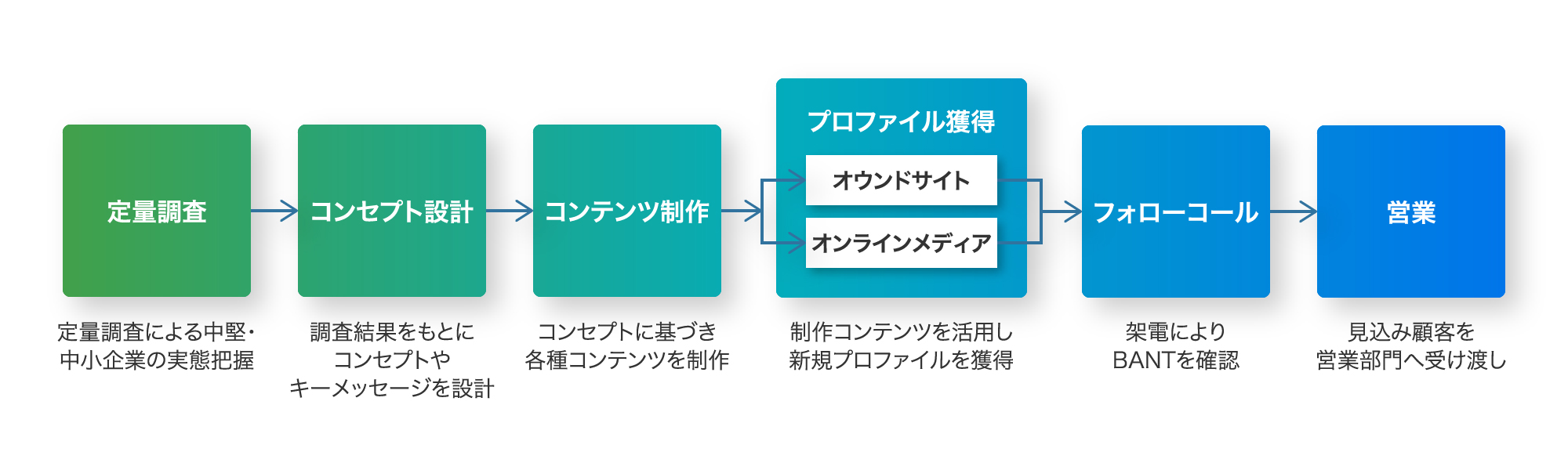 新規見込み顧客を発掘したい 中堅・中小企業の実態調査から、コンセプト設計、コンテンツ制作、プロモーションによる見込み顧客発掘までワンストップでご支援。