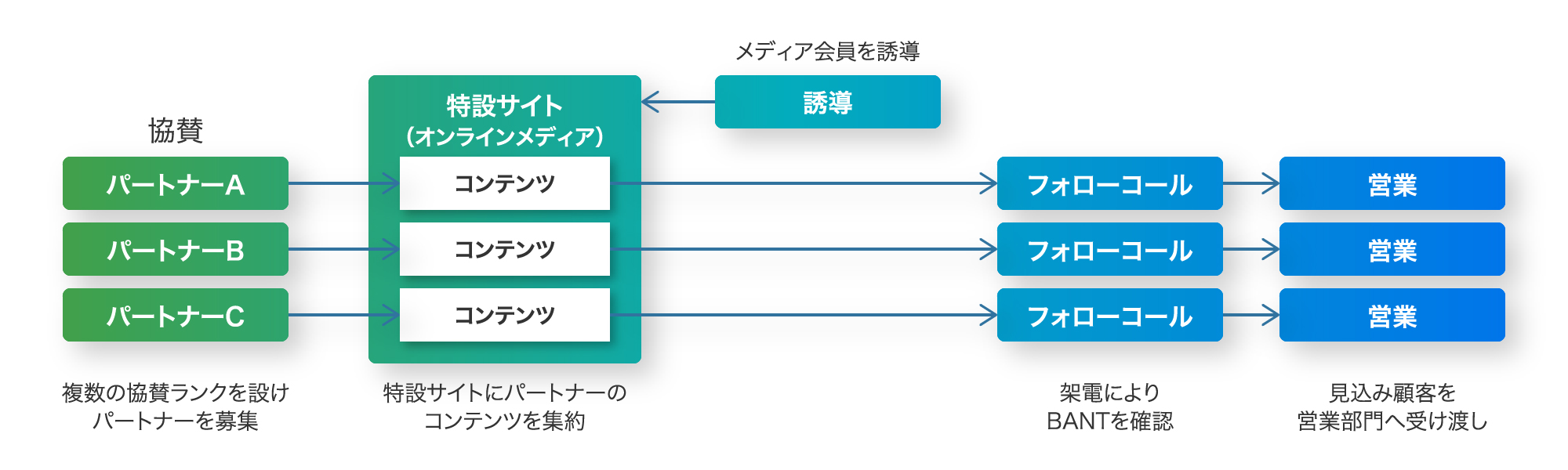 スケールメリットを活かした 施策を行いたい オンラインメディア上でパートナー協賛型のプログラムを設計し、コンテンツを集約させることで興味関心者を効率的に獲得。